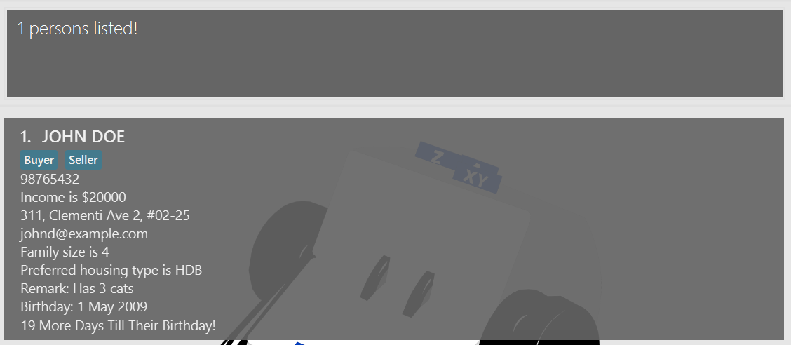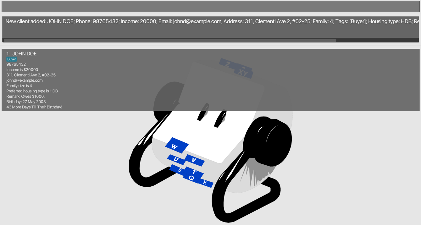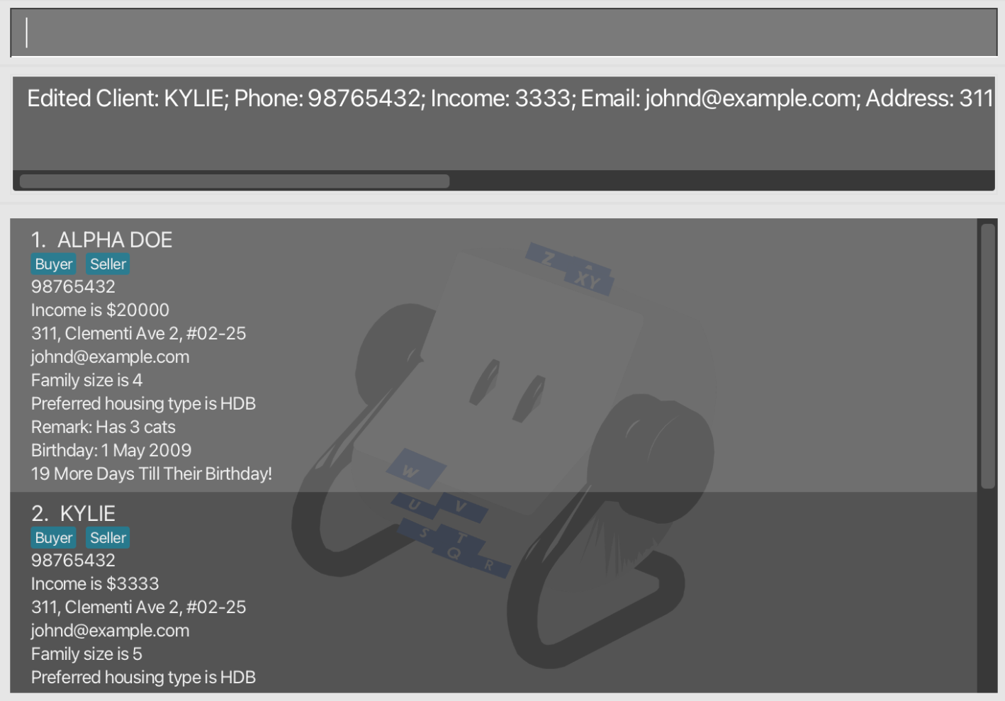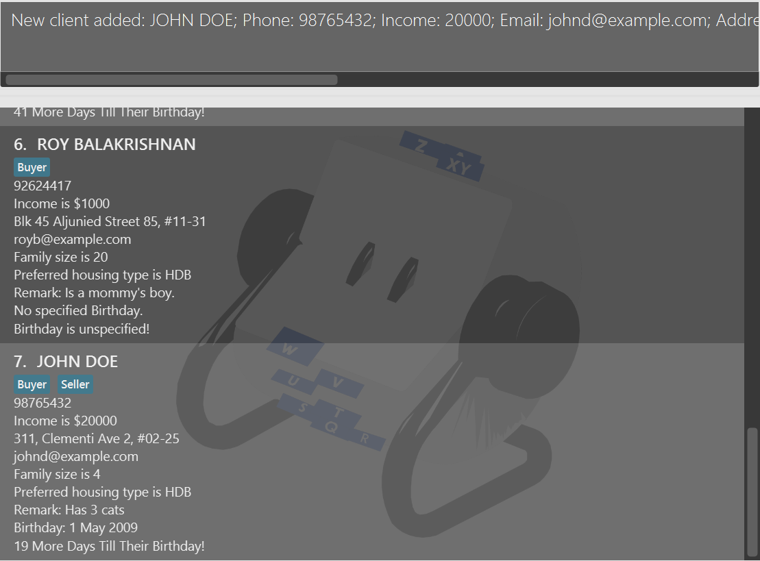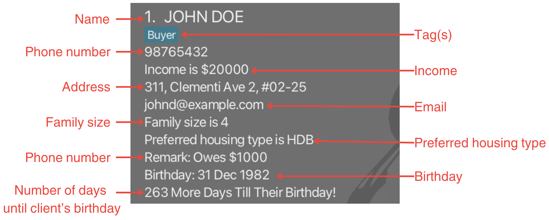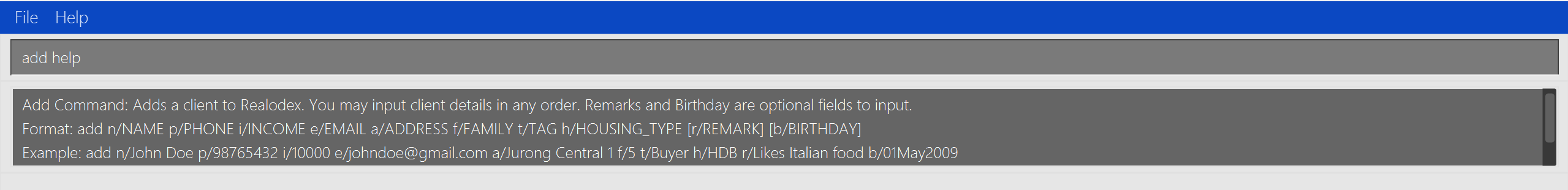 Add | add n/NAME p/PHONE i/INCOME e/EMAIL a/ADDRESS f/FAMILY t/TAG h/HOUSINGTYPE [r/REMARK] [b/BIRTHDAY] e.g. add n/John Doe p/98765432 i/20000 e/johnd@example.com a/311, Clementi Ave 2, #02-25 f/4 t/Buyer h/HDB r/Likes cats b/31Dec1982 |