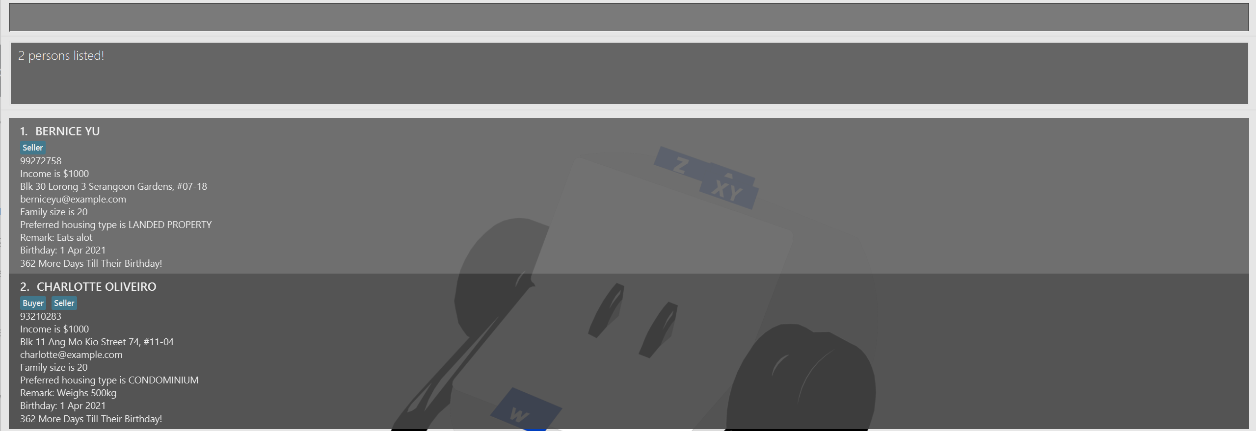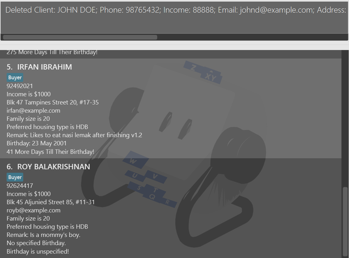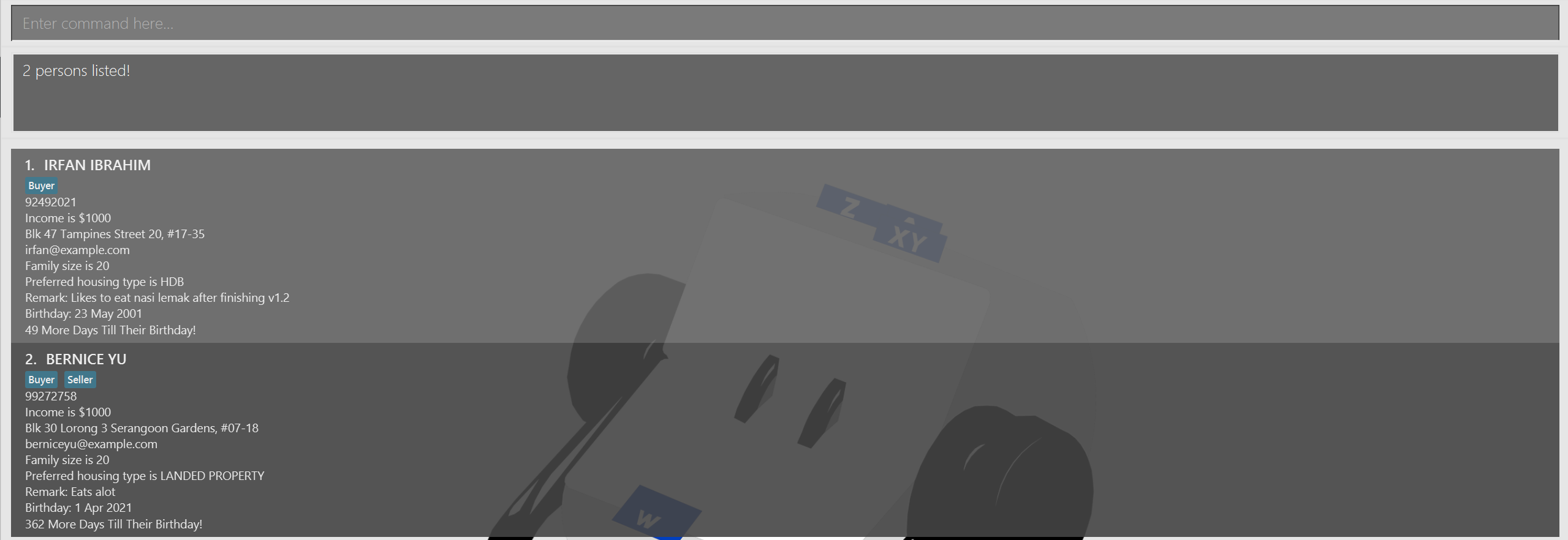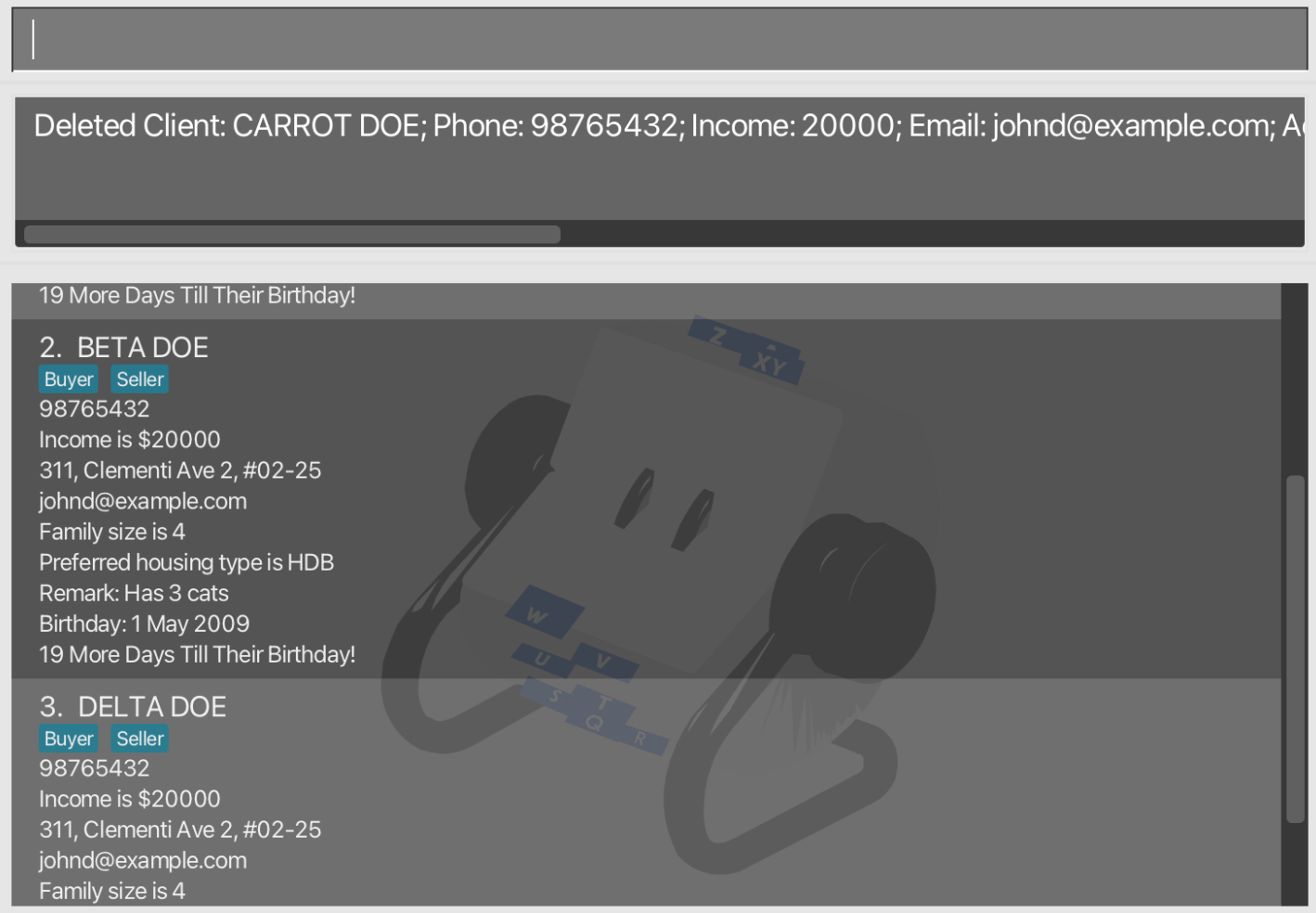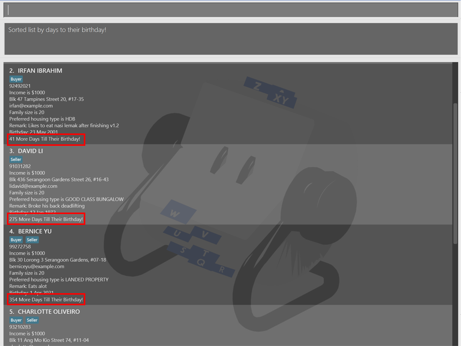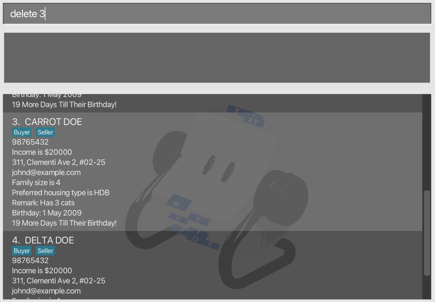 Add | add n/NAME p/PHONE i/INCOME e/EMAIL a/ADDRESS f/FAMILY t/TAG h/HOUSINGTYPE [r/REMARK] [b/BIRTHDAY] e.g. add n/John Doe p/98765432 i/20000 e/johnd@example.com a/311, Clementi Ave 2, #02-25 f/4 t/Buyer h/HDB r/Likes cats b/31Dec1982 |