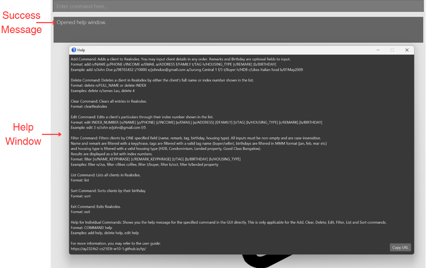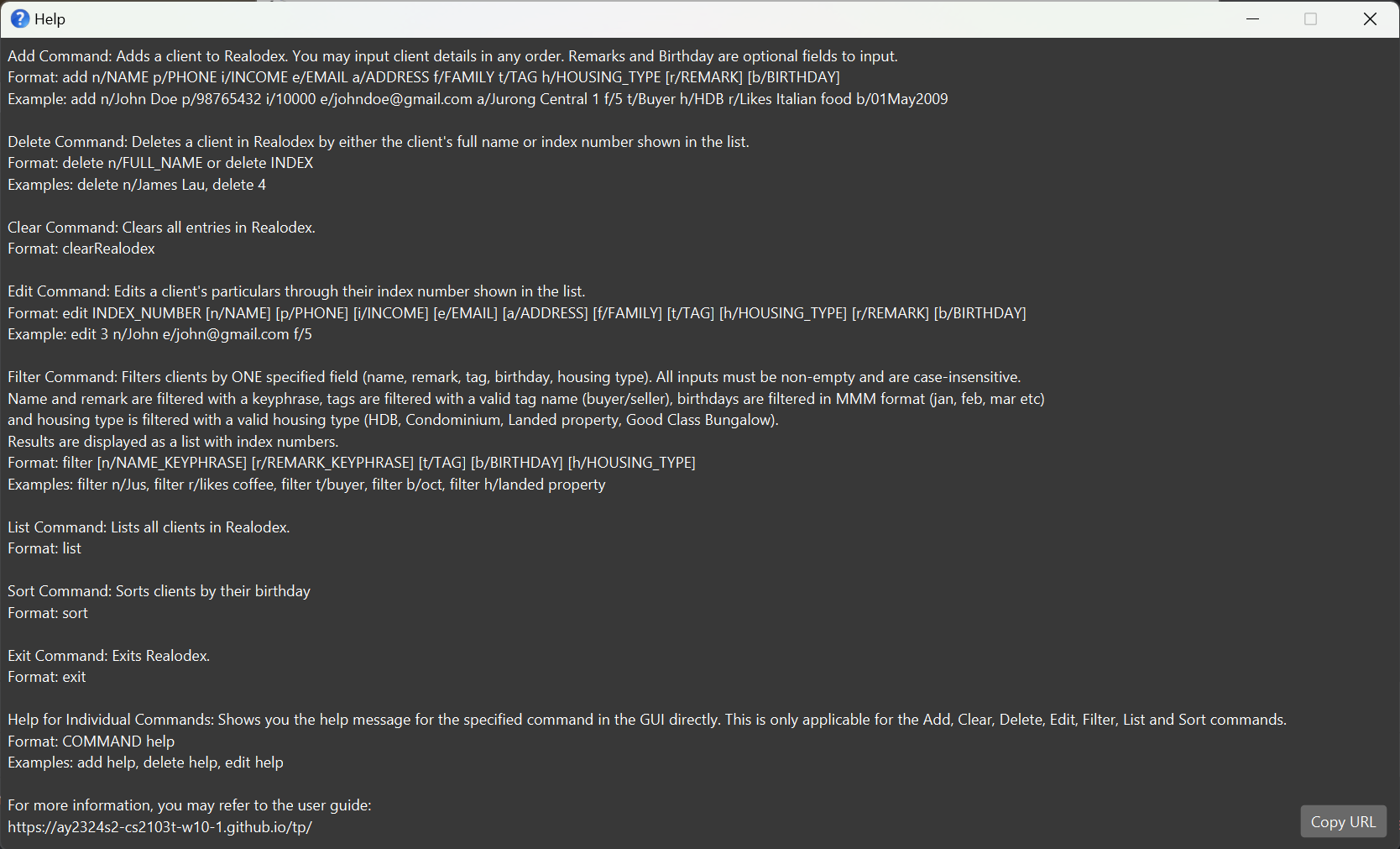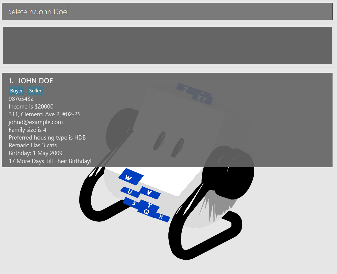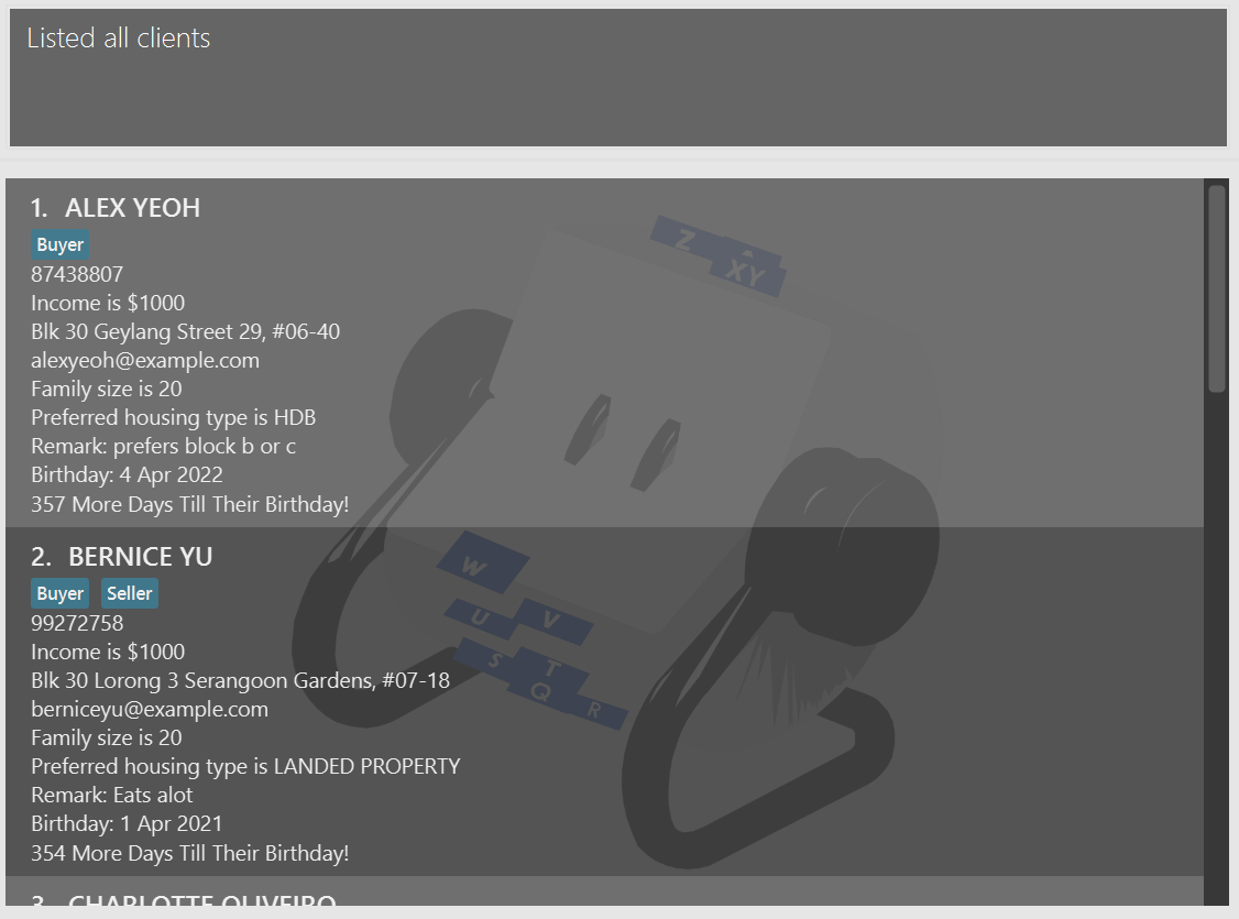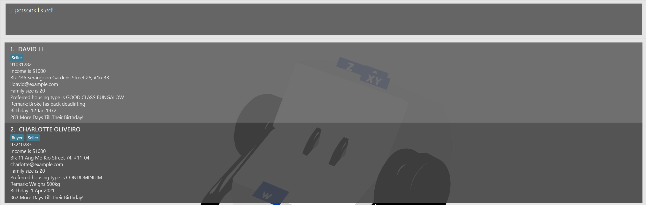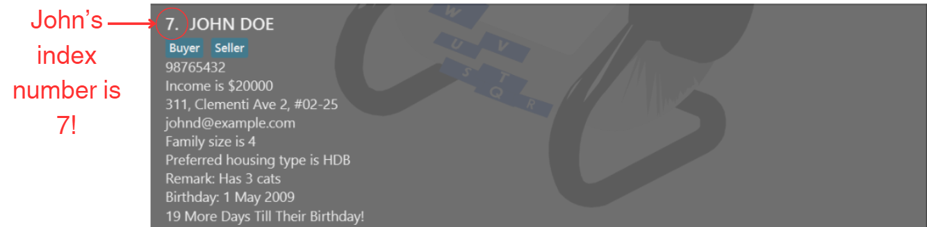 Add | add n/NAME p/PHONE i/INCOME e/EMAIL a/ADDRESS f/FAMILY t/TAG h/HOUSINGTYPE [r/REMARK] [b/BIRTHDAY] e.g. add n/John Doe p/98765432 i/20000 e/johnd@example.com a/311, Clementi Ave 2, #02-25 f/4 t/Buyer h/HDB r/Likes cats b/31Dec1982 |