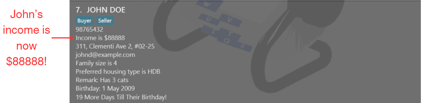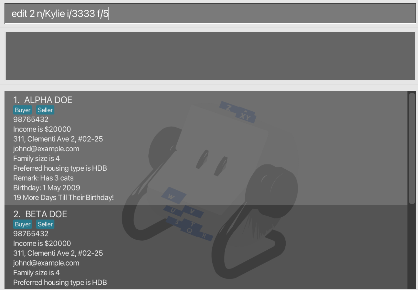 Edit | edit INDEX [n/NAME] [p/PHONE] [i/INCOME] [e/EMAIL] [a/ADDRESS] [f/FAMILY] [t/TAG] [h/HOUSINGTYPE] [r/REMARK] [b/BIRTHDAY] e.g. edit 2 n/Denzel i/100000 |