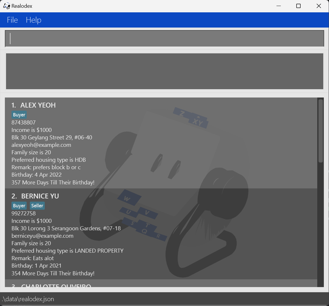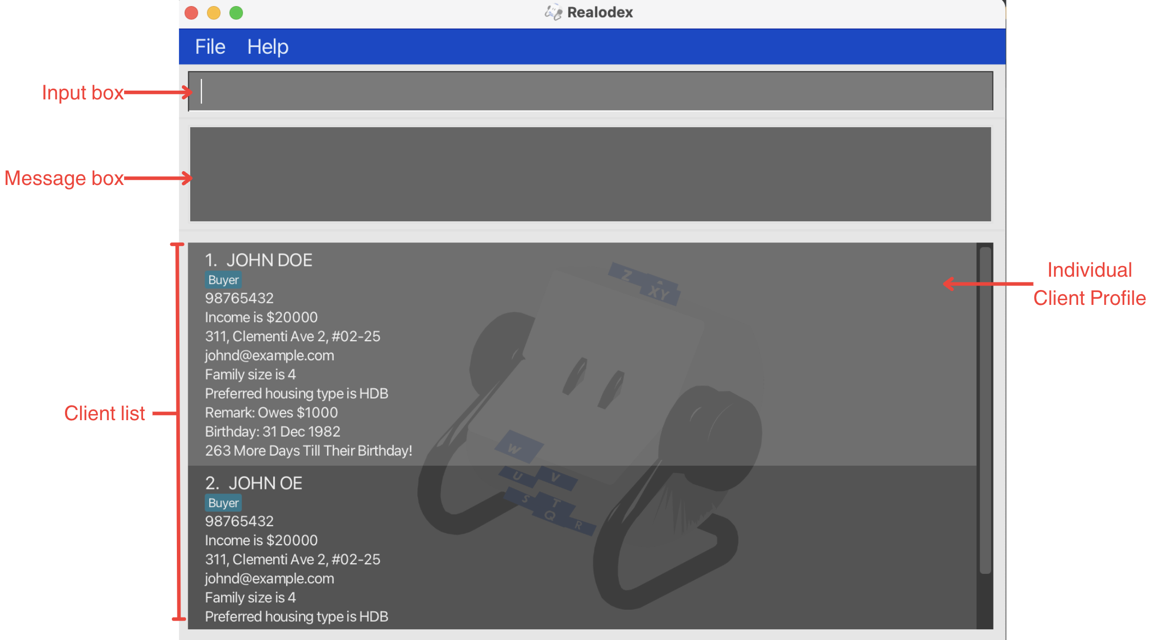 Realodex features a GUI crafted to deliver a seamless user experience. The GUI is structured into several distinct components, each designed to enhance your interactions and efficiency.