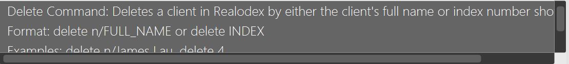 Delete (by name) | delete n/NAME e.g. delete n/John |