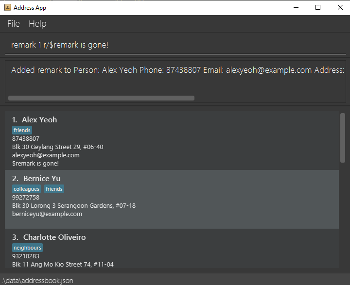 This command allows users of the AddressBook application to add optional remarks to people in their address book and edit it if required. The command should have the following format: